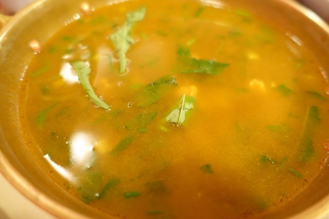 〆はトムカーガイ。スパイスと酸味の強い、ココナッツミルクのスープです。具は鶏肉主体。トムヤムクンはガっと火がつくようにスパイシーな味覚ですが、こちらは穏やかな香辛料にココナッツミルクの甘さが加わり、冬にコタツで食べたくなるような味わいでした。