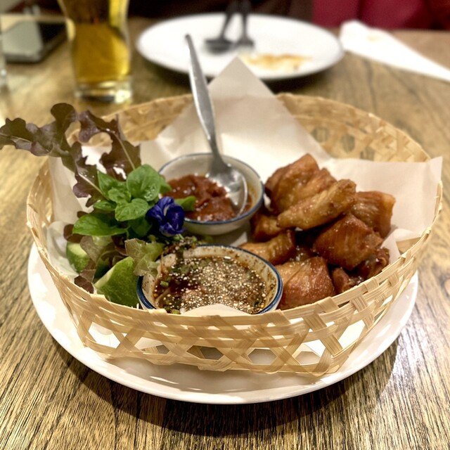ポークをチリソースにディップして食べるスタイルでこちらもタイでよくあります。
