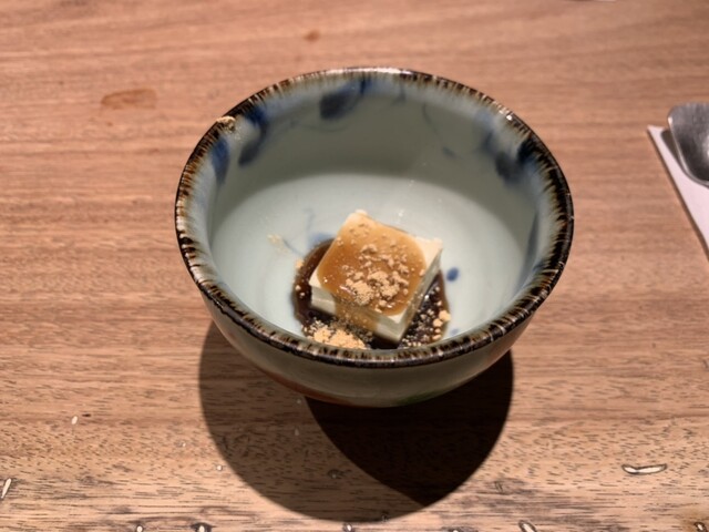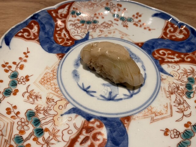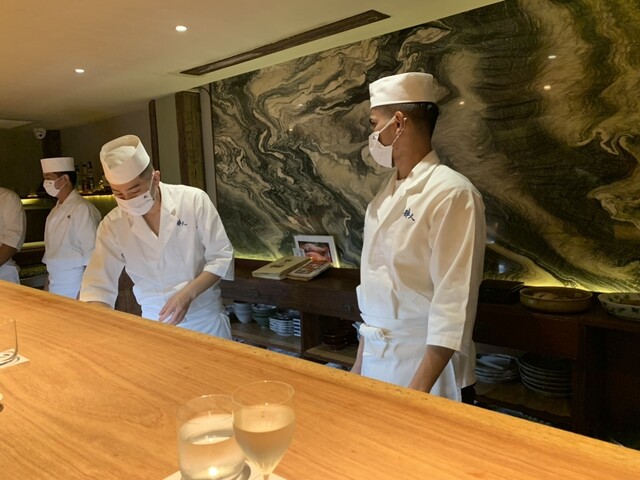 アソークの星付鮨店、3階建で各階カウンター備えられています。今晩は3階で菅野さん担当とあります。おまかせコースですが、例により日本酒のお値段お高いです〜。お料理は少なめのお安いコース、他のお客さんは大きな蝦夷鮑・セイコカニ入コース。甘口だけどなかなかの旨さです(๑˃̵ᴗ˂̵)