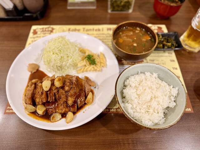 こちらの看板メニューは、なんといっても「トンテキ(豚のステーキ)」です!タニヤにある串かつ専門店「いし本」で大人気だったメニューを専門店にしたのが「神戸トンテキ」の由来らしい〜一口食べると、閉じ込められていた肉汁がじゅわ〜っと広がります♡ただの豚ステーキじゃありません!なんと90分間じっくり低温調理されていて、断面は美しいピンク色♡食感は「これ本当に豚肉!?」と疑うほど、しっとりジューシーで驚くほど柔らかく美味しいです。