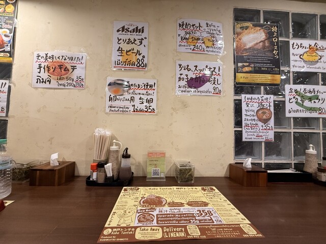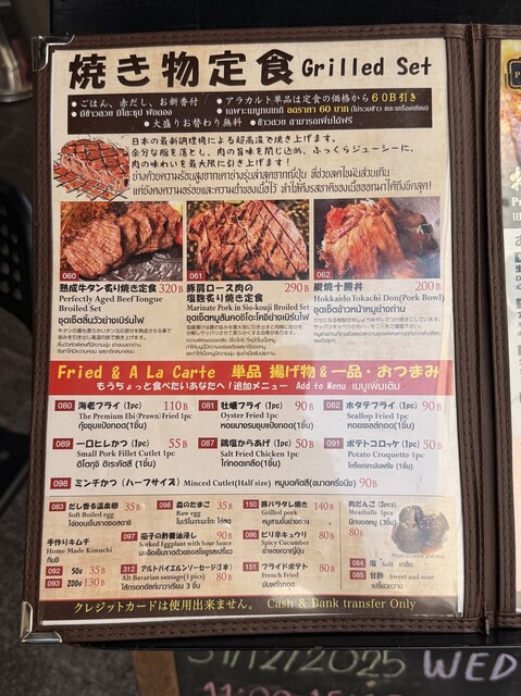 メニューは、サイズ展開が豊富なので、少食の方からガッツリ食べたい方まで安心です!レディースとんてき定食150g/260バーツ、とんてき定食200g/280バーツ、大とんてき定食300g/340バーツ、メガ大とんてき定食400g/400バーツです。他にも、特製ロースかつ定食360バーツや、熟成牛タン炙り焼き320バーツなど、魅力的なメニューがいっぱいでした。
