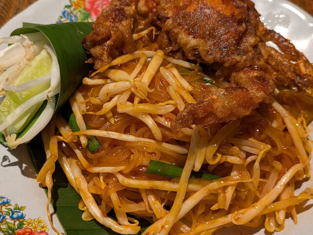 〆にソフトシェルクラブの焼きそば。麺は平打ち米麺を用いており、もちもちとした噛み応えがクセになる美味しさ。程よく辛く甘酸っぱい風味がソフトシェルクラブに良く合い、食堂などで食べるパッタイとはまた違った魅力を奏でます。