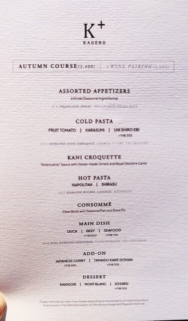 同時にドリンクメニューも出されます。3,600バーツでワイン4杯のペアリングもありますが今回は単品で。