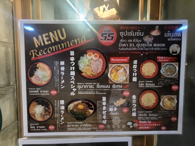 日本からの到着が9時過ぎで雨も降りだしたので近くの名古屋の店で晩飯。この店がタイ人がオーナーさんのFC1号店でオーナーさんは元々縫製工場を営んでおり取引があった日本でらーめん食べ歩きをやっていた。でも名古屋の居酒屋チェーンをやりたいと思って名古屋のコンサルと連絡を取っていたら「フジヤマ55」総本店を紹介され、濃厚つけ麺に衝撃をうけてタイで流行らそうと路線を変更して名古屋でスープ製法や製麺を学んだそうで、今は「がブチキ」もやっている。
