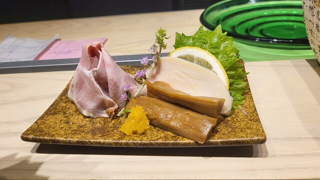 麺の上には豚・鶏・鴨チャーシュー、帆立刺身とイクラ、大葉、紫蘇の花。