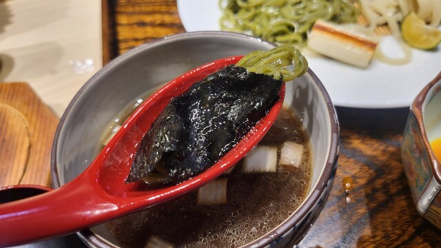 抹茶を練り込んだ中太麺は醤油味の鴨つけ汁につける。