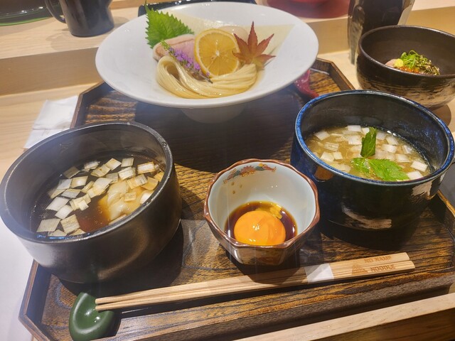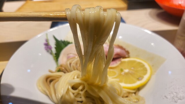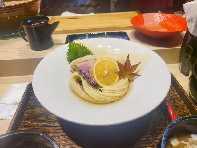 現在はオンラインで予約可能。オンライン制が導入される前は電話で予約していたが、繋がることはまずないという人気ぶり。なんとか予約できて暖簾をくぐり、注文したのは昆布水つけそば。麺線が整えられた麺は芸術作...