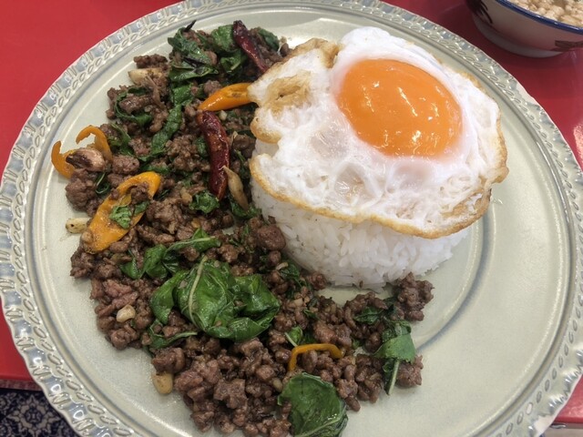 バンコク在住の知人から教えてもらったガパオライスの有名店です。ターミナル21から徒歩圏内です。朝の9時開店とのことで、昼は別途予定あっので朝ご飯で朝イチ訪問です。大通りから少し横道入った静かなと言うか人気のない通りにあります。昼は行列とのことでしたが、さすがに朝はお客さんもまばらでした。ガパオライスは朝から食べるにはボリューミーなんでしょうね。