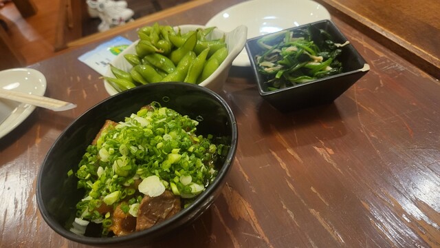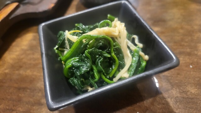 ビールのアテはほうれん草お浸し、枝豆、牛スジ煮込、白肉&広島産牡蠣鉄板焼。