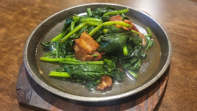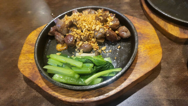 白肉のてっぱん焼き、唐揚げ、ポパイベーコン、砂肝のニンニク焼き。