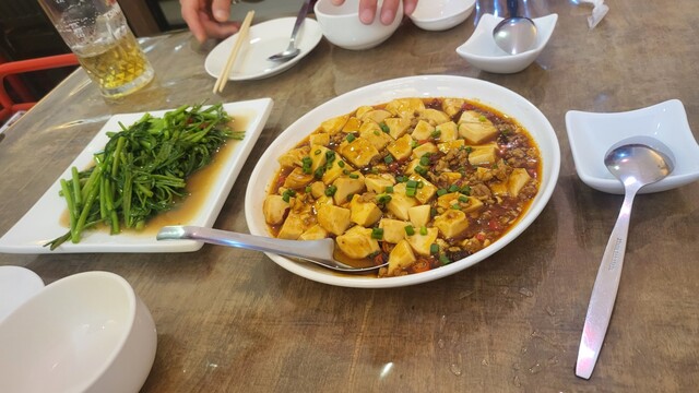 空芯菜炒め、餃子、麻婆豆腐、回鍋肉等をアテにチャンビールと持ち込みのウィスキーでハイボールを朝から...