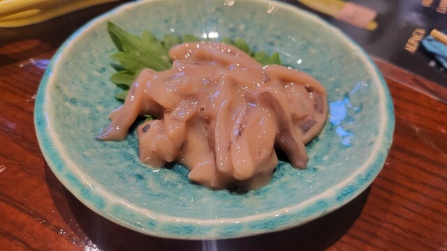 お通しに函館イカ耳塩辛、秋鮭の血合いのめふん。