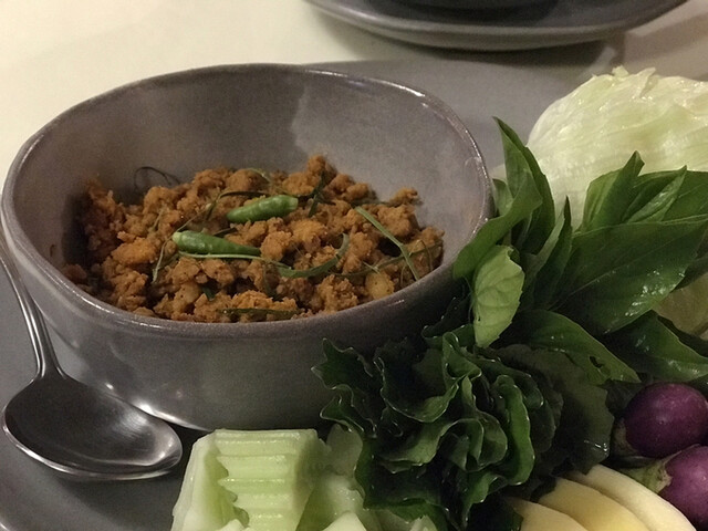 シグネイチャー料理《クアクリンムーサップ》豚の挽肉の青唐辛子炒め。生野菜に包んで食します。