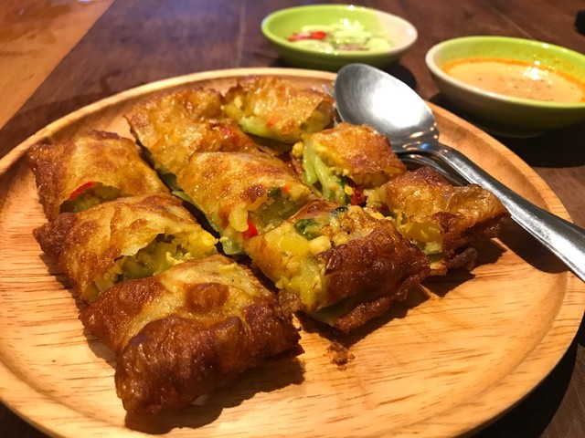 濃厚なカレー味の鶏ひき肉と野菜をロティで包み込み揚げたもので、雰囲気をわかりやすく伝えると「カレーお好み焼き揚げ」ってな感じ。