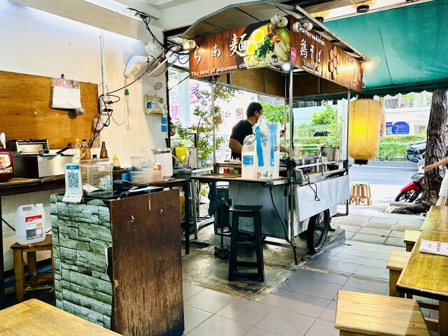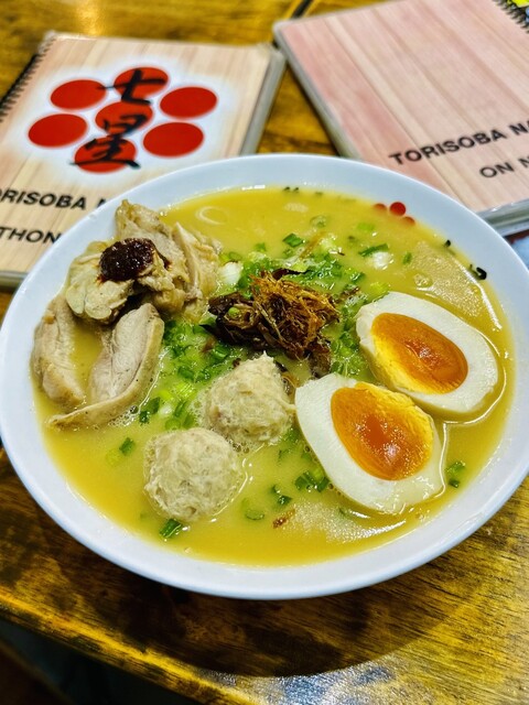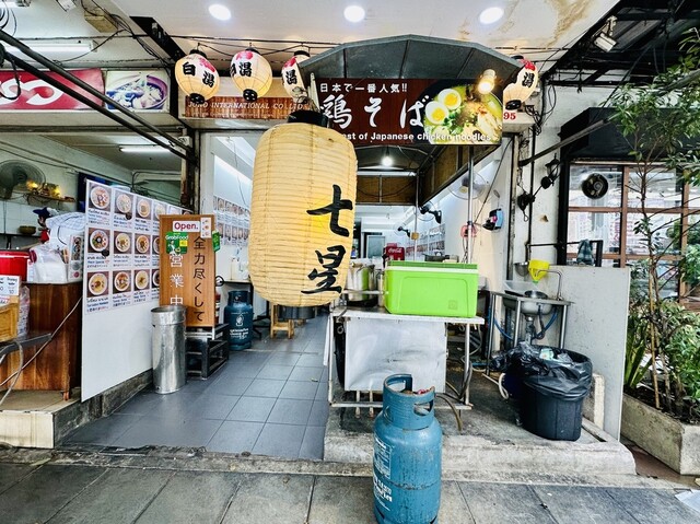 外観は通り沿のアーケード街にあり!大きな「鶏そば七星」が目印です☆店内はカウンター席とテーブル席があり!スタッフはタイ人のワンオペです!日本語は喋れませんが、日本の教育が施されている接客サービスを感じます!調理場は店内になく、入口付近にリアル車輪のついた屋台の中で調理されていました。