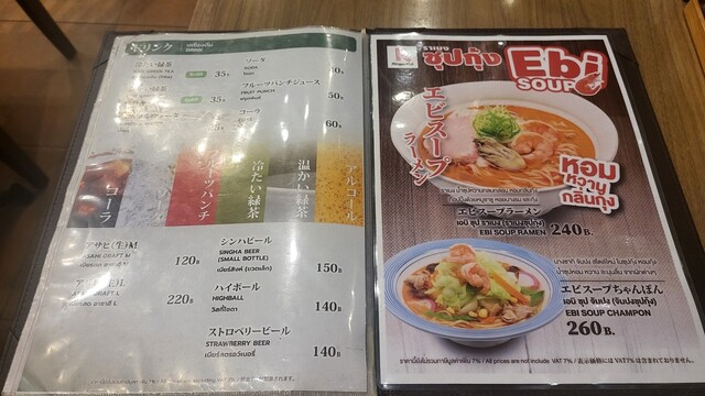 エビスープちゃんぽん260THB, 唐揚げ3個75THB(VAT, サ料別)