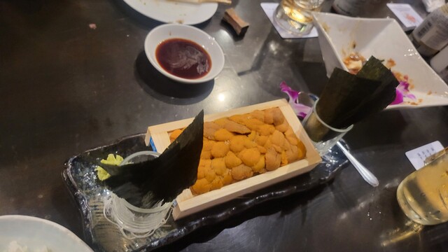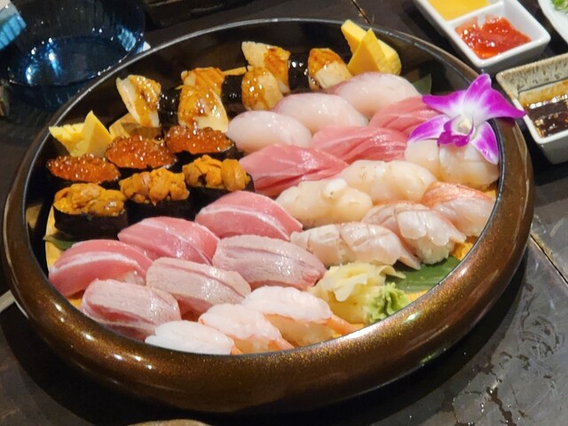 本日の宴はビックCにあるマグロで有名な店。マグロは勿論の事ウニやら金目鯛やらクオリティの高いお魚さんが食べられる。鮨もふつうにうまい。〆は昨日と同じざるらーめんだけど、中細卵麺に酸味のあるおつゆなのでまったく違った。ワサビがついてなかったのでお寿司についていたものを流用。量的にも味的にも〆によい。