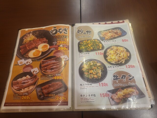 黄船つけ麺310THB、半熟煮玉30THB、肉野菜炒め120THB, 生ビールセット129THB (VAT別)