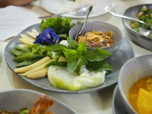 ナンプリッククーンセッはいろんな野菜に、小鉢に入ったピリ辛ソースをかけて(つけて)食べる料理です。日本では見ないような野菜がたくさんで興味津々で食べていました。ピリ辛ソースは干しエビが入っていて、干しエビから出る風味とコクがまた素晴らしかったです。