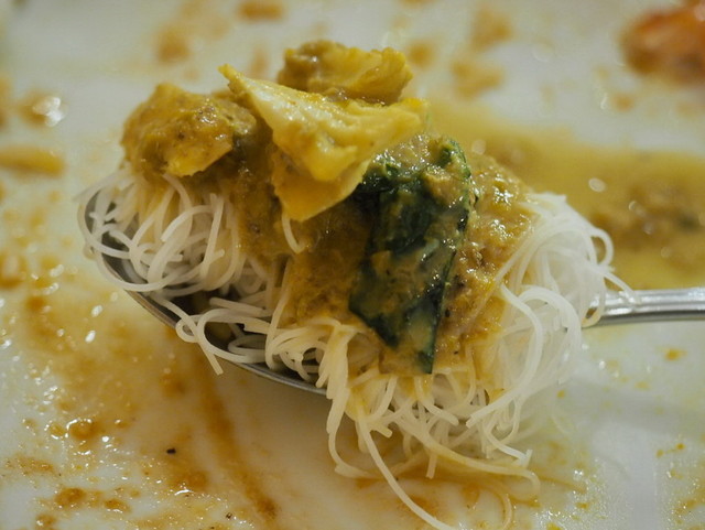 カノムチーンゲーンプーバイチャプルーは、そうめんのような麺にココナッツベースのカニの身入りのピリ辛ソースをかけていただきます。麺は、実はそうめんではなく、米から作った麺をさらに発酵させているらしいのですが、酸っぱくも発酵した香りもありませんので、そうめんと言われてもわからない感じです。