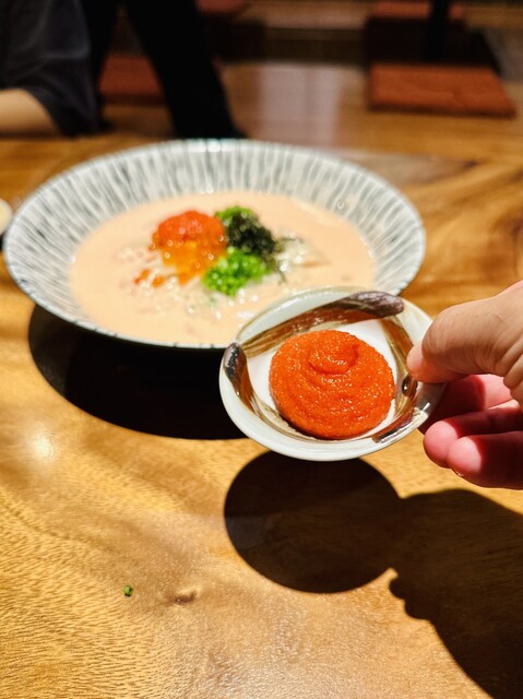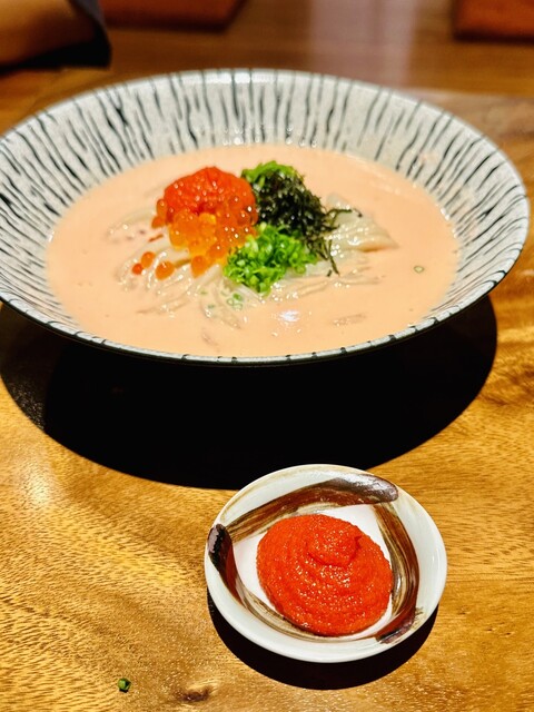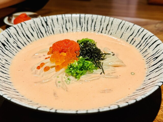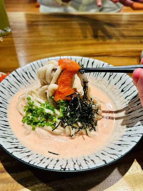 「明太子クリームうどん」は、和風白だしに牛乳などのクリーム系が明太子と混ざり合っていい塩梅!麺は極太!かなり豪麺&硬麺で喉越しよく食べることはできません「もぐもぐ」と顎が疲れるくらいの噛みごたえを感じつつ食べ進んでいく〜好みにもよりますが、もう少し茹で時間を長くし、もちもちとした柔らかさを出して欲しいと思いました!トッピングは「明太子」「刻み海苔」「青ネギ」です!小皿で「天かす」と「紅ショウガ」が付いてきます。