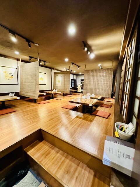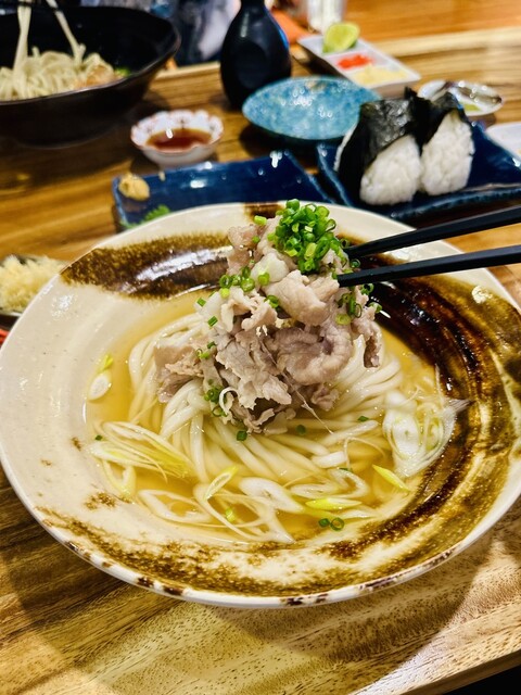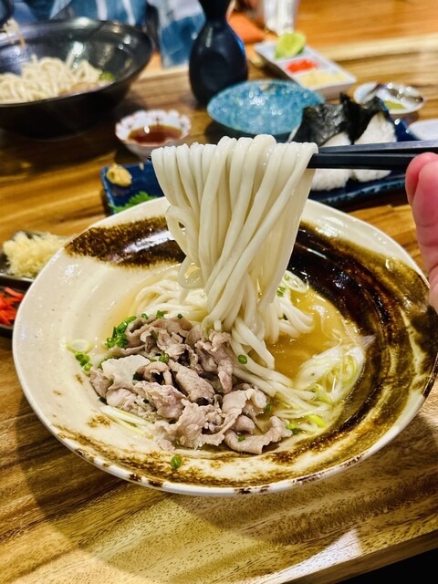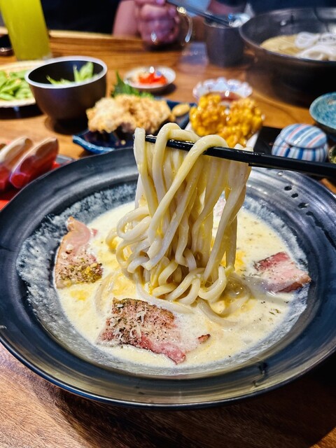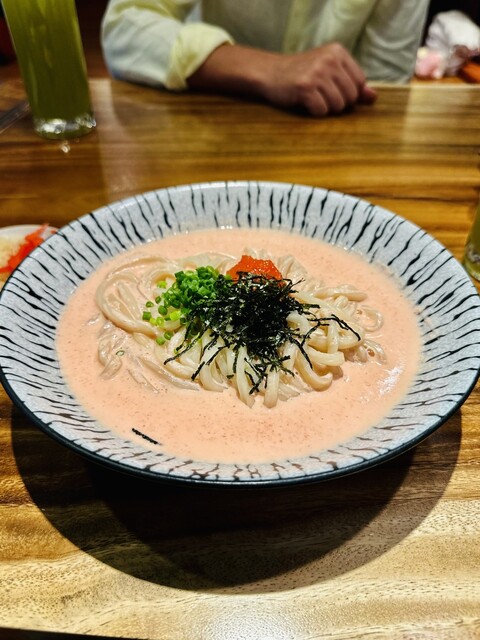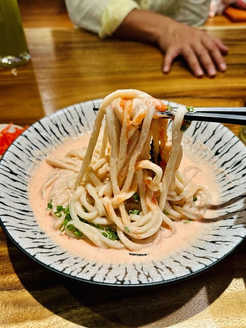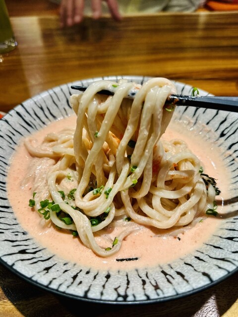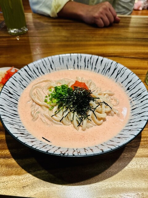 外観は2階建集合テナントの2階!店内はカウンター席、掘りごたつテーブル席、個室などある和風テイストな雰囲気となっています〜こだわりは自家製生麺!メニューを拝見すると「つるとんたん」をオマージュした構成で、冷たいうどん「ぶっかけおろしうどん」熱いうどん「豚しゃぶうどん」や「明太子クリームうどん」「カルボナーラうどん」などから、ご飯ものは「高菜明太マヨ牛丼」「タコおにぎり」一品もの「コーン天ぷら」「とり天」などがあります。