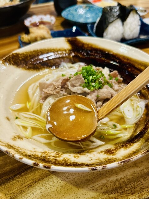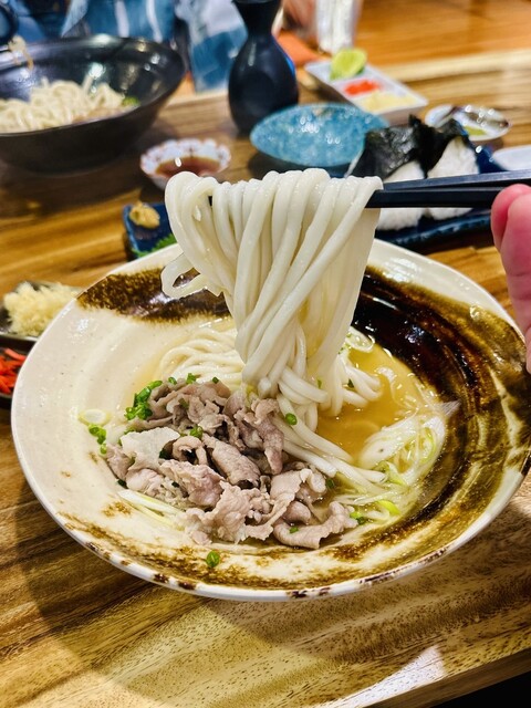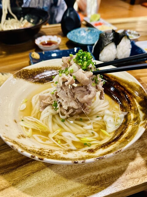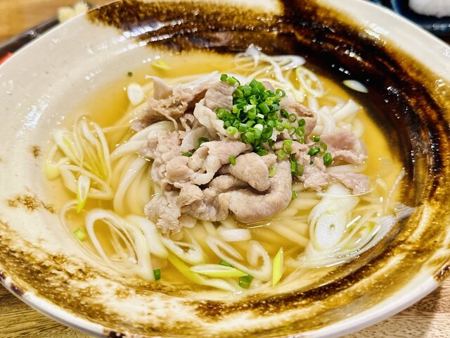 頂いたのは「豚しゃぶうどん」「明太子クリームうどん」「きつねうどん」です!先ずは「豚しゃぶうどん」のスープから〜お出汁がしっかりと効いて美味しい!トッピングの豚肉はあっさりと脂身少ない部位!白ネギ、青ネギとシンプルながら安定の味!麺はつるもちでスープや具材との絡みもよく美味しかった。