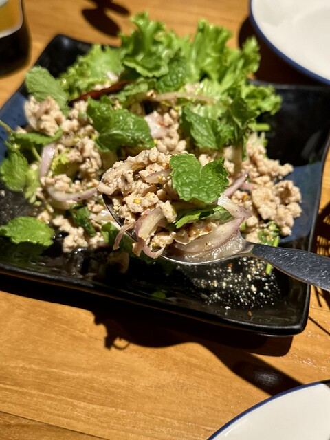 乾いた喉をビールで潤す乾杯☆そして先ずは「豚ひき肉のスパイシーサラダ」から〜美味しい!豚ひき肉にエシャロットやパクチーにミントの葉がナイスコラボ!味付けはナンプラーやライムで爽やかな酸味と旨みがクセになる!辛さは調整して貰えるので苦手な方はスタッフに伝えましょう!タイ東北部「イサーン」の代表的料理で「もち米」と食べるのが一般的みたいです。