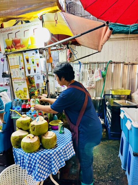 「BTSトンロー駅」改札4番出口階段を下り右手を見ると、明るい屋台が見えてきます!入口には、マンゴーとフルーツスムージーの屋台があり、奥には約10軒くらいの屋台が集まっています!フードコートには、自由に座れる共用のテーブルがあり、様々な店の料理を楽しめます。