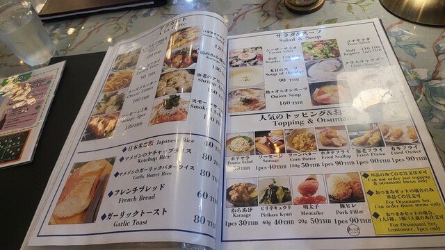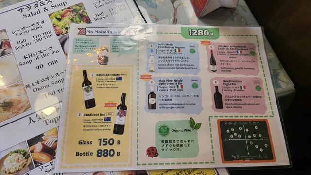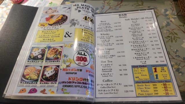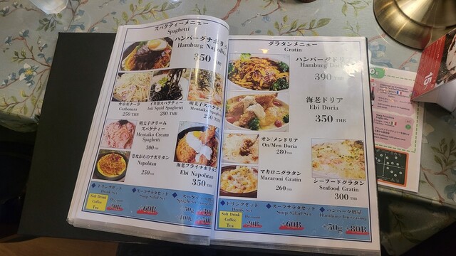 昔ながらのナポリタン250THB、マ メゾンハンバーグ160g320THB、シーザーサラダハーフ110THB、レモンサワー150THB
