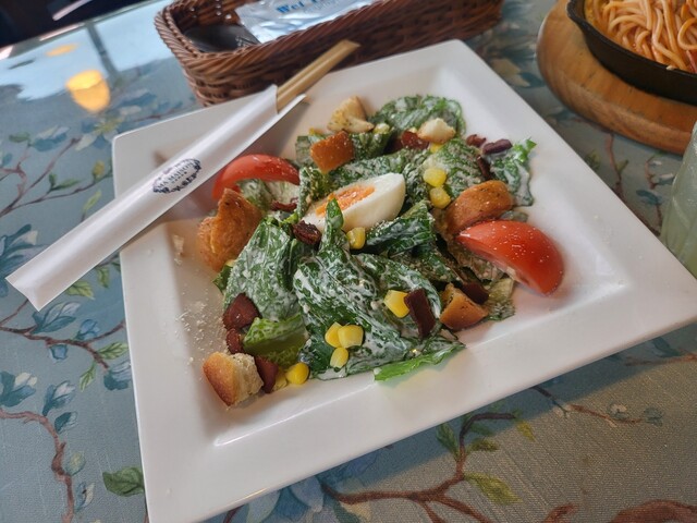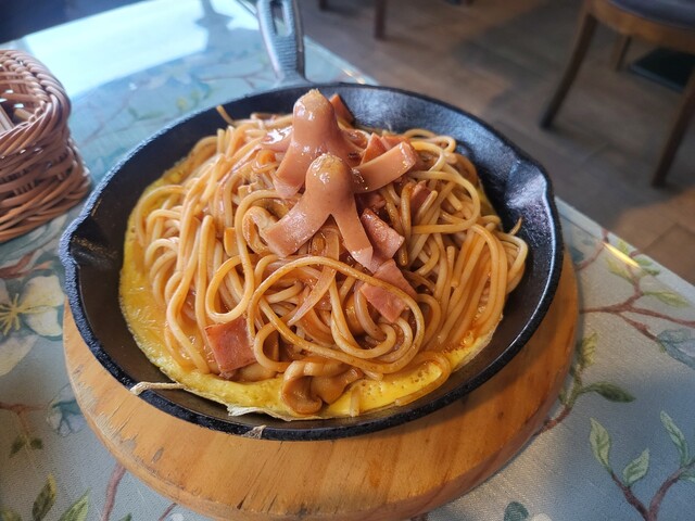 昔ながらのナポリタン250THB、マ メゾンハンバーグ160g320THB、シーザーサラダハーフ110THB、レモンサワー150THB