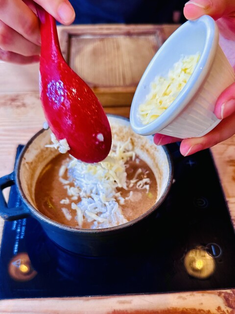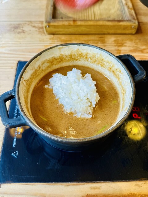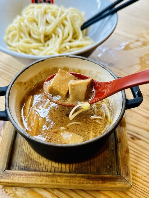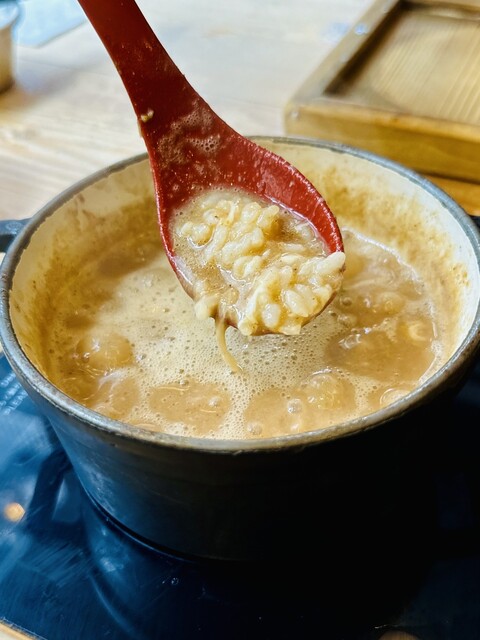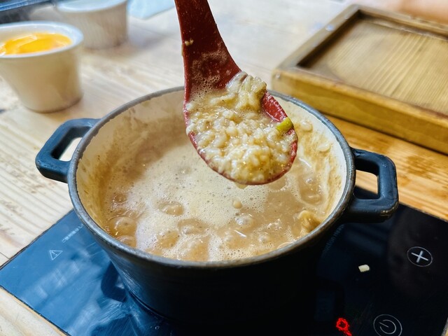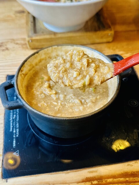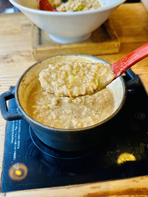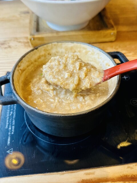 先ずは「つけ麺」から〜つけ麺!おすすめの食べ方のとおりに、麺から食し!つけ汁にたっぷりと漬けズズッと!魚介豚骨で一口目は久しぶりで美味しいけど、福岡で食べたフジヤマ55「つけ麺」と比べたらイマイチ物足りなかったな〜変わらないところは、つけ麺のスープが冷めてしまっても、卓上にあるIH調理器で温められるので、最後まで熱々で楽しめます!「麺」はモチモチ太麺で美味しい!メンマは戻し方に問題あって硬い!チャーシューはサイコロカットで食べ応え有り!途中「卵」を投入し「ニンニク」入れ電磁調理器で温めると「カルボナーラ」みたいになって美味しい♡〆は「おじや」です!残った「つけ汁」に「ご飯」を投入し、IH調理器で温めると完成!卓上にある、マヨネーズ、ラー油、お酢などを加えて、残ったスープと一緒に味変!別格の味でした。