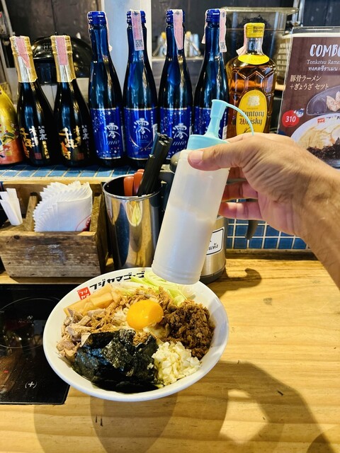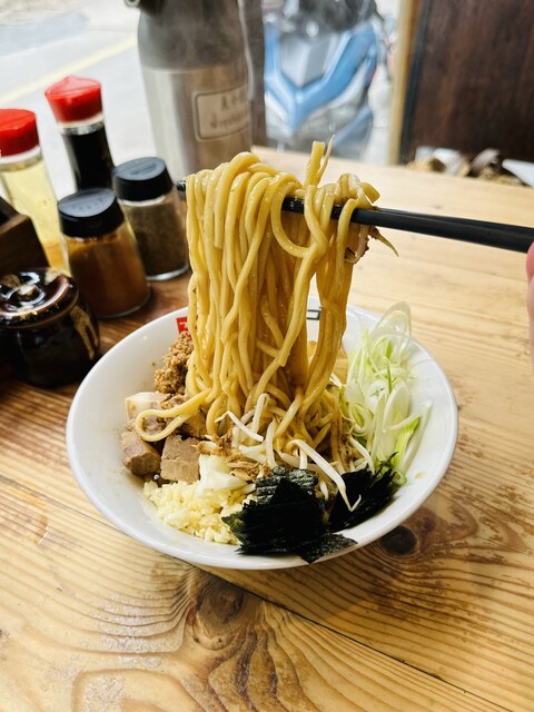 次に「元祖まぜそば」のおすすめの食べ方とおりに、丼の下から全体をかき混ぜて麺を食します!ズズッと極太い麺を啜ってみる〜美味しい♡次に専用アイテム「マヨネーズ」「花椒」「すりごま」「カレー粉」を、食べる分だけ味変してみると鬼ウマ♡このアイテム追加するだけで、ジャンキーな食べ物に大変身!ニンニクと黄卵がマヨネーズと絡み麺との三位一体感は最高です。