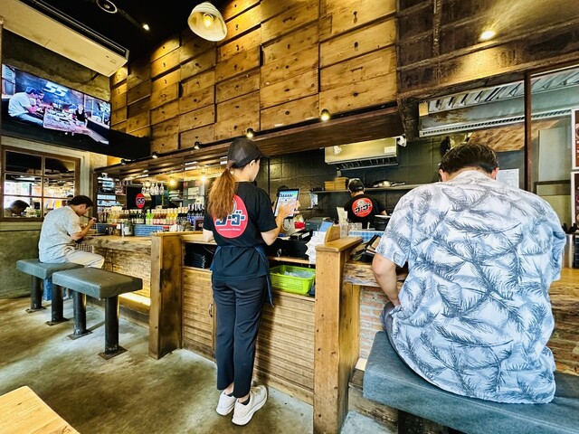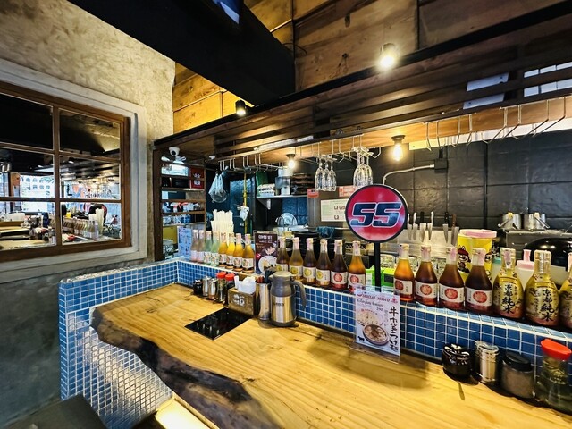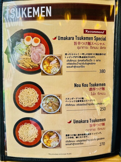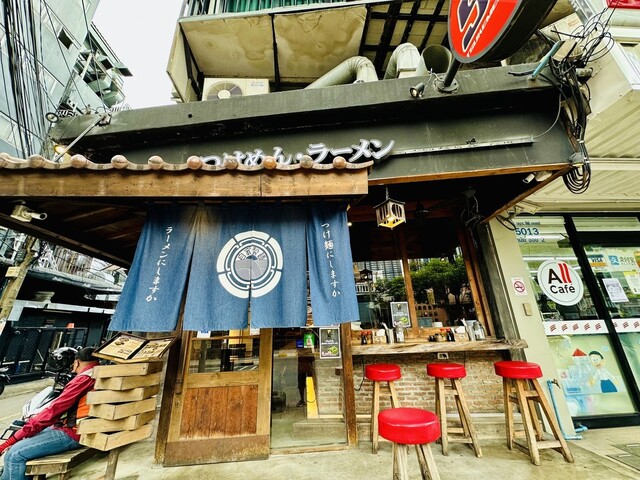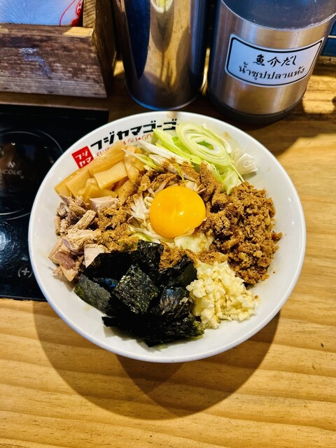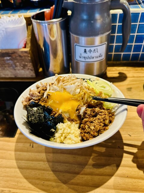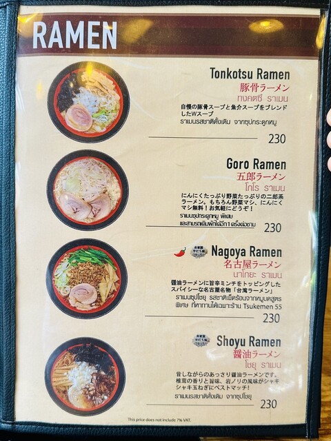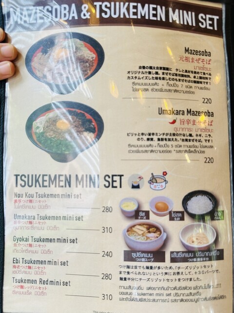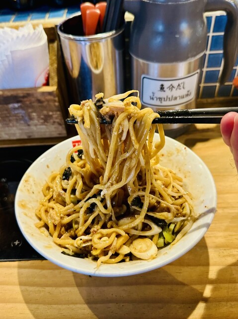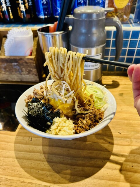 外観は雑居ビル1階!店内はカウンター席とテーブル席があり、IHヒーターが完備されています!スタッフはオールタイ人!メニューは定番「つけ麺」から「元祖まぜそば」「豚骨ラーメン」「五郎ラーメン」「醤油ラーメン」「名古屋ラーメン」「旨辛ラーメン」に「鉄板チャーハン」「チャーシュー丼」「旨辛丼」「餃子」そしてつけ麺の〆に「ご飯」「チーズ」「生卵」などです。