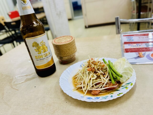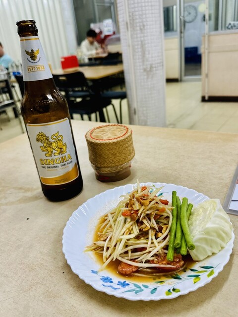先ずはビールで乾杯!そして「ガイヤーン」ハーフサイズが配膳されてきました!パクリとかぶりついてみる「美味しい」皮はパリッと、身はふっくら、味も塩味と漬け込んだタレがいい塩梅で期待通り!食べやすくカットされているので良いね☆合わせる「カオニャオ」がベストパートナー♡辛さを調整した「ソムタム」に「ガイノンサポークヤーン」とイサーン料理を楽しめました。