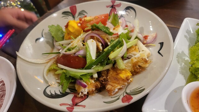 チャレンジメニューのタイ風スパイシーサラダ・ヤムカイダオ。...