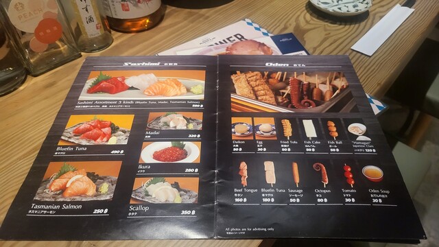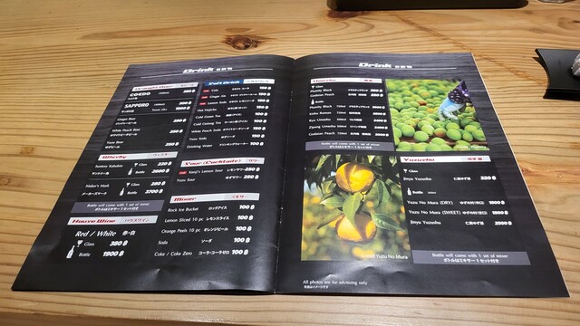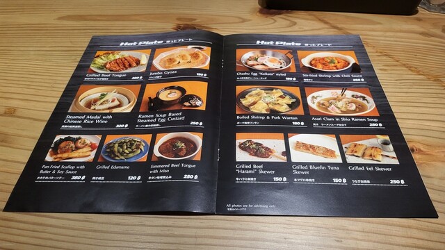 Niboshi Shio Ramen 490THB, Ika Sumi Fried Rice 280THB, レモンサワー250THB, マグロ串焼き150THB, 豆腐サラダ220THB, おでん210THB, ゆずサワー250THB, 串かつ130THB (VAT,サ料別)