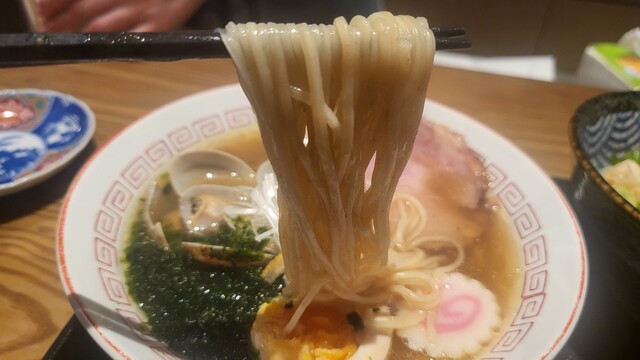 円やかなあっさりアサリスープに食感の良い細ストレート麺が合う♥