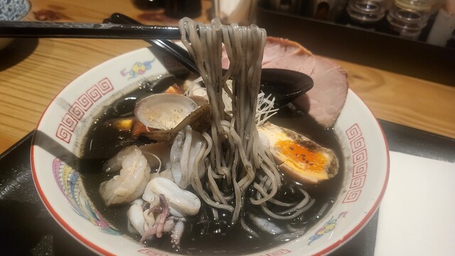 チャーシュー、白髪ネギ、トマト、味玉に浅蜊、イカ、エビの魚介うまし。