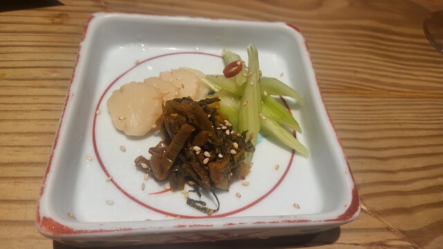 アテはいつもの豆腐サラダ、漬物盛り合わせ、豚串かつ、本鮪串焼きとおでん。