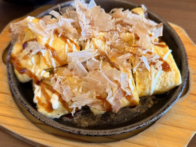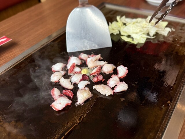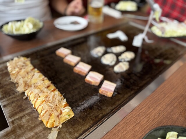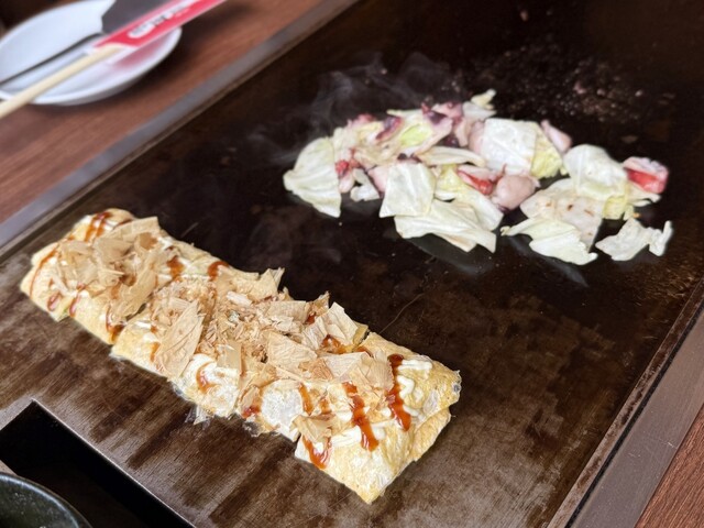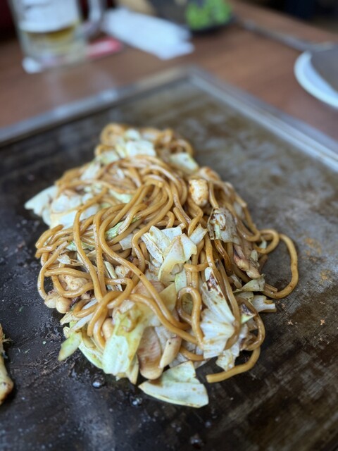 モダン焼き!お好み焼きに麺を合わせたモダン焼きはボリューム満点! これだけでお腹いっぱいになるので、友人や家族とシェアするのがおすすめでしょう〜ココの料理は、ほとんどがキッチンで調理されてからテーブルに運ばれてくるので、服に匂いがつく心配がありません!食事を楽しみたいけど匂いが気になるという方には必見です。