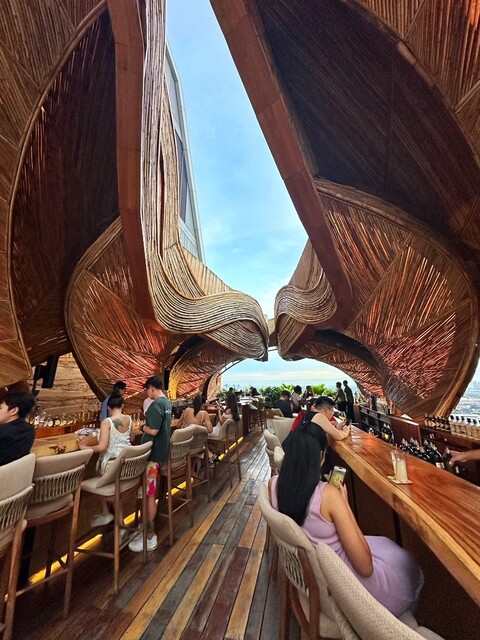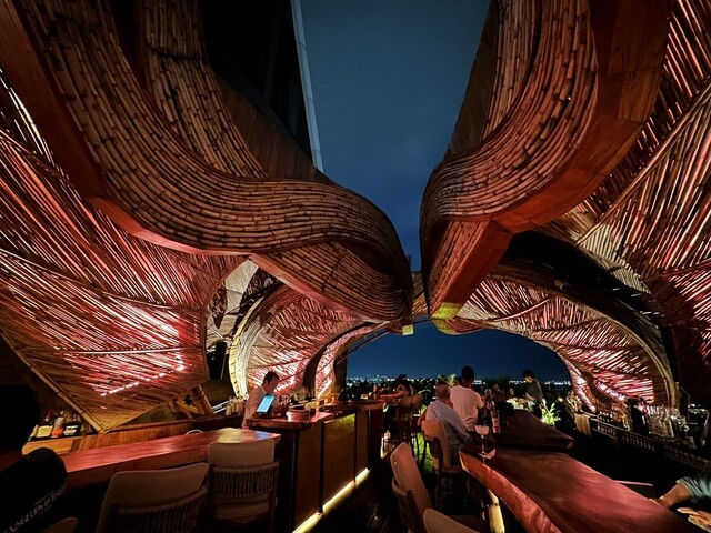 開放感あるバーカウンターを覆うように作られた、竹製の有機的なルーフのデザインが素晴らしい。日本では建築法上で無理な素材とデザインではないだろうか…笑。当日は17時半に訪れたが、日没とともに空間の雰囲気が一変。夜空にライトアップされたルーフが浮かび上がり、幻想的な光景を生み出していた。