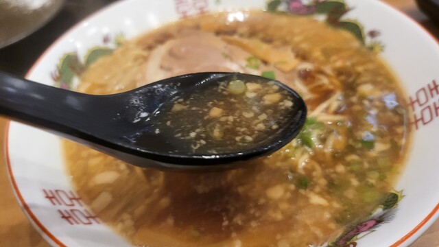 背脂が浮いた濃い醤油スープに細ストレート麺。