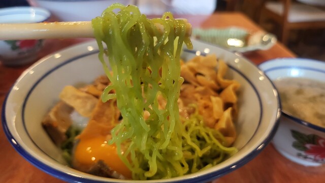 細く縮れた翡翠麺にトムヤムダレの汁無し麺。