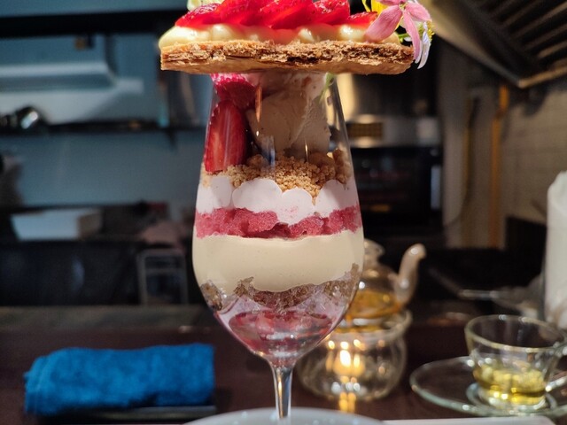 グラスの中は上からイチゴアイス、ピスタチオアイス、イチゴ果肉、クランブル、ストロベリーチーズクリーム、ピスタチオパンナコッタ、イチゴシャーベット、白ワインゼリー、フレッシュミックスベリー。