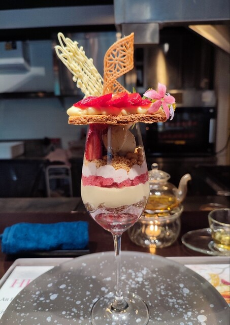 「世界各国の五つ星ホテルや名門レストランで30年以上のキャリアを誇る実力派日本人パティシエが、目の前で創り上げる“ライブデザート”が楽しめる。季節ごとに表情を変えるパフェやアシェットデセールを用意。」