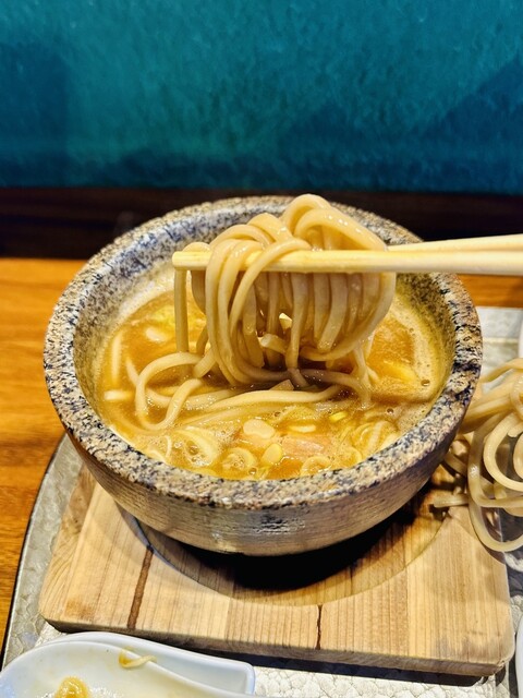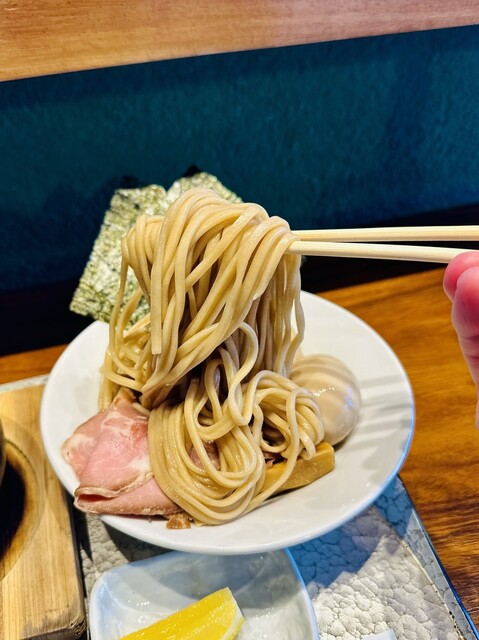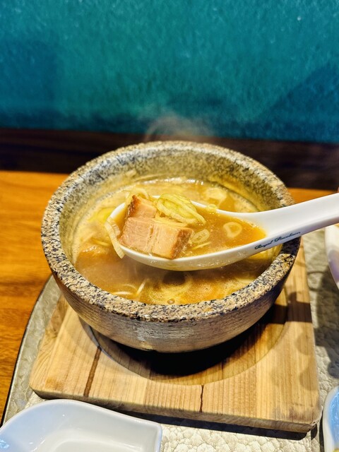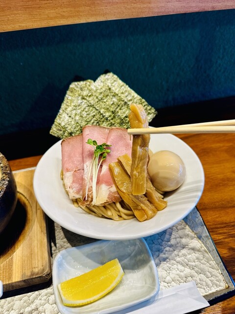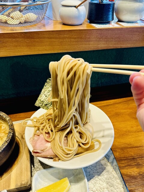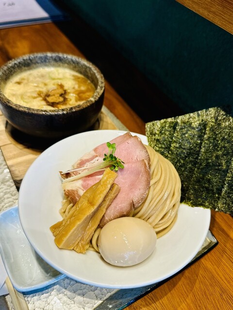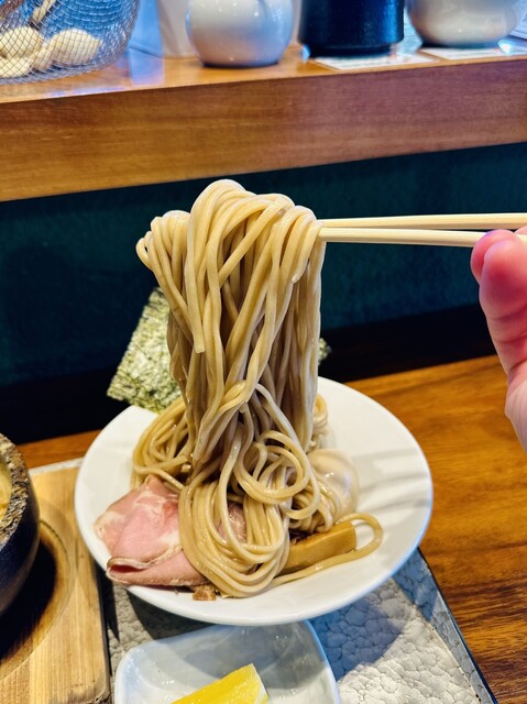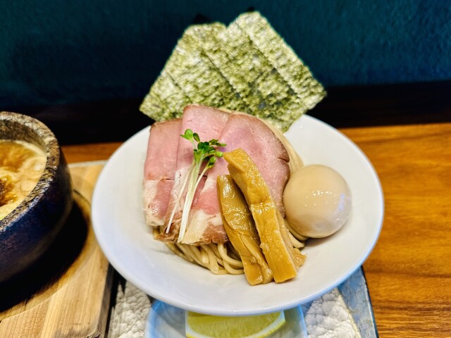 配膳されてきた「濃厚つけ麺」は見ためも綺麗で美しい!スープは石焼でグツグツ煮立っており熱々です!まずはスープから〜美味しい♡鶏ガラと豚骨が濃厚に炊き上げられ、魚介類(昆布、鰹節など)が良いバランスとなり期待以上のクオリティに驚きました!この美味しさは日本でもトップクラスだと思います。