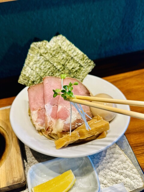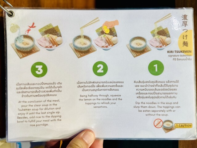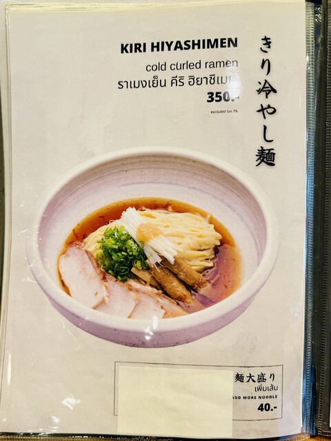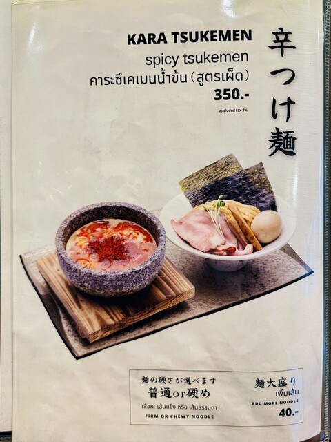 コチラはバンコクで一世風靡した「鶴うどん」の系列店で、2023年1月にオープン!外観は「鶴うどん」と同じ2階フロア!店内はカウンター席とテーブル席とあり!カジュアルなカフェのような雰囲気!メニューは「つけ麺」と「ラーメン」とがあり、つけ麺は「濃厚つけ麺」「辛つけ麺」「背脂つけ麺」「ゆず塩つけ麺」ラーメンは「白ラーメン」「醤油ラーメン」「塩ラーメン」「背脂醤油ラーメン」があります。