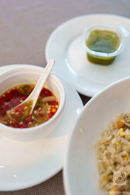 味変でチリソースやシーフードソースを付けて食べるとスッキリした辛味が追加されてめっちゃ美味しい。グリーンのソースがオススメですね。