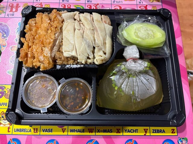 注文したのは「ข้าวมันไก่ผสม(カオマンガイ・パソム)」という蒸し鶏と揚げ鶏が乗ったカオマンガイです。